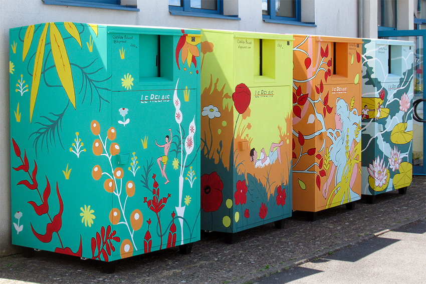 Cette œuvre artistique realisée par Clothilde Prévost transforme une série de bornes containers appartenant à l’entreprise philanthropique Le Relais en une fresque continue, où la nature reprend sa place au cœur de l’environnement urbain.