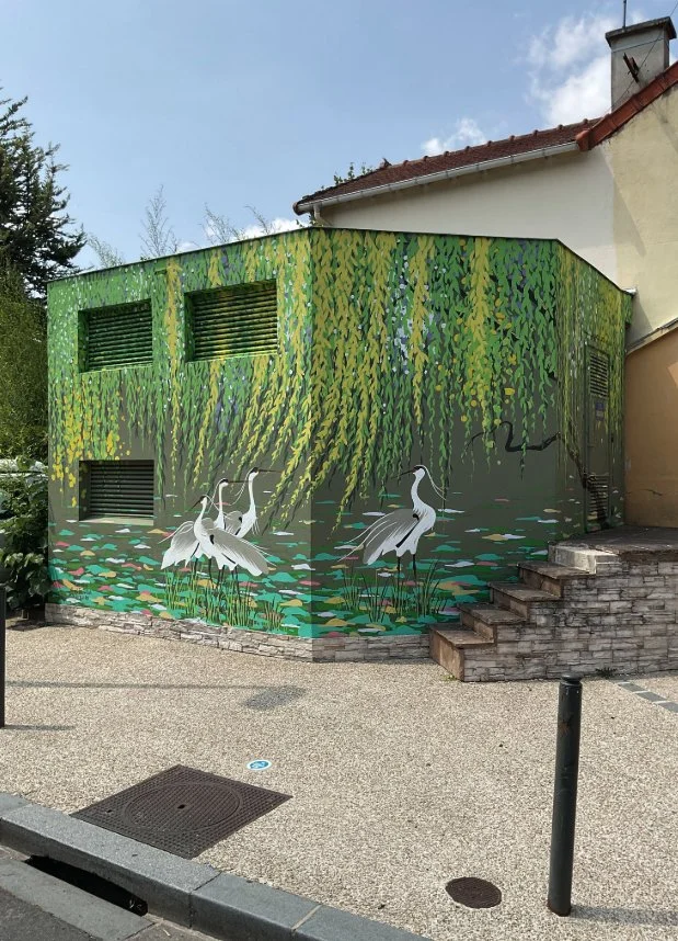 Cette fresque murale réalisée par Gaël transforme la façade d’un transformateur EDF en un paysage naturel immersif, inspiré des milieux humides et de la végétation aquatique. L'œuvre joue sur une composition verticale et enveloppante : de longues lianes végétales tombent depuis la toiture et recouvrent progressivement la surface du mur, créant l’impression que la nature reprend doucement possession de l’architecture.